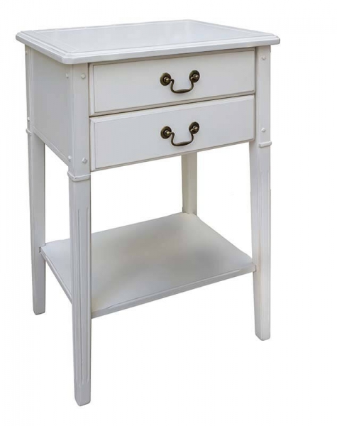 Укомплектован двумя вместительными ящиками, расположенными друг под другом. Темный оттенок металла ручек стильно оттеняет светлое дерево. На ножках присутствуют элементы резьбы. Имеется нижняя открытая полка для журналов и других принадлежностей.